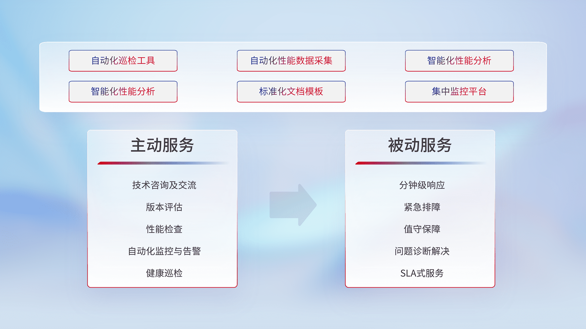 智能化工具和标准化文档,,保障服务质量,,,提供主动服务(包含技术咨询、、、版本评估、、性能检查、、自动化监控与告警、、健康巡检)和被动服务包含(分钟级响应、、紧急排障、、、值守保障、、、、问题诊断解决、、、SLA服务)。。。。